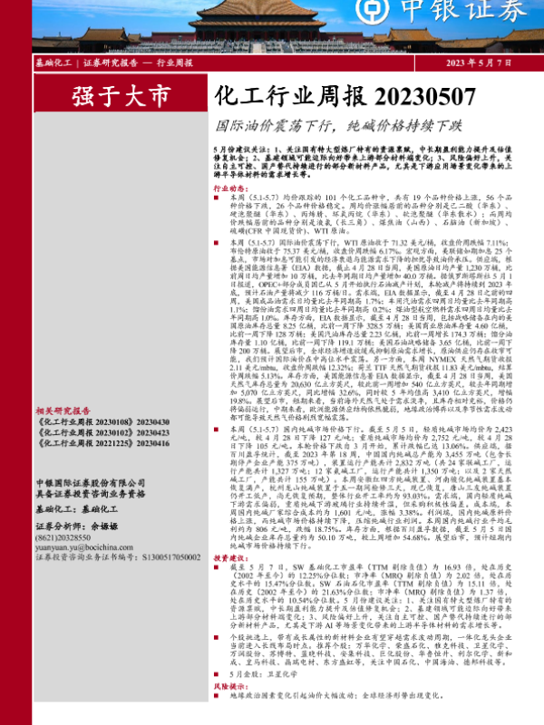 【中银证券】【20230507】20230507-中银证券-化工行业周报:国际油价震荡下行,纯碱价格持续下跌-12页