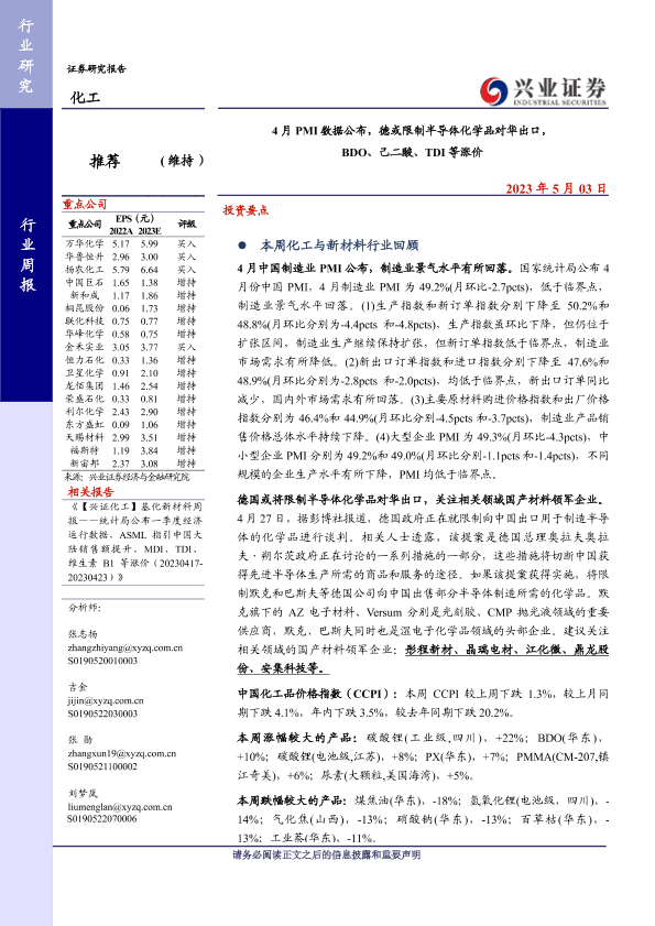 【兴业证券】【20230503】4月 PMI数据公布,德或限制半导体化学品对华出口, BDO、己二酸、TDI等涨价-46页