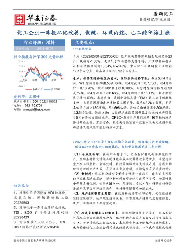 【华安证券】【20230507】20230507-华安证券-基础化工行业周报:化工企业一季报环比改善,聚醚、环氧丙烷、己二酸价格上涨-43页