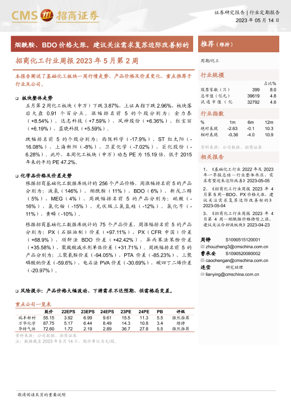 【海通证券】【20230514】2023年5月第2周化工行业周报:烟酰胺、BDO价格大涨,建议关注需求复苏边际改善标的-20页