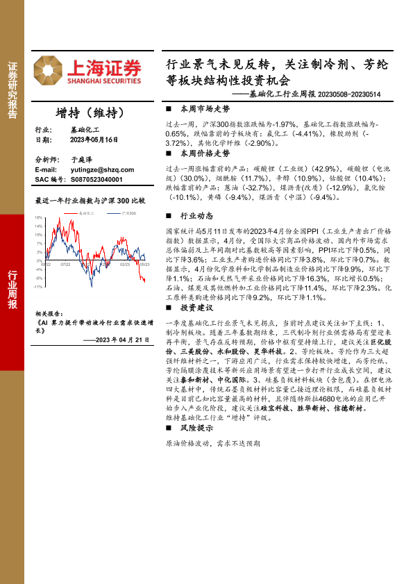 【上海证券】【20230516】基础化工行业周报:行业景气未见反转,关注制冷剂、芳纶等板块结构性投资机会-13页