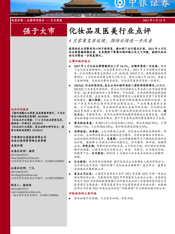 【中银证券】【20230522】20230522-中银证券-化妆品及医美行业点评:4月零售复苏延续,期待后续进一步改善-13页