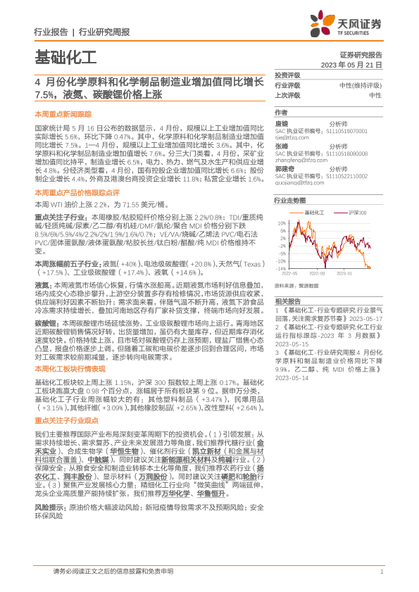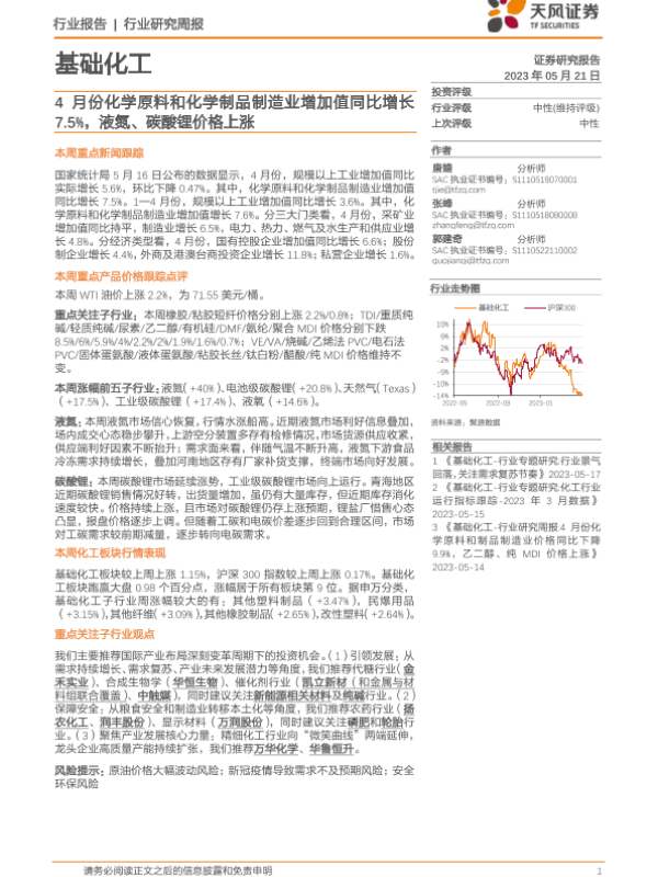【天风证券】【20230521】20230521-天风证券-基础化工行业研究周报:4月份化学原料和化学制品制造业增加值同比增长7.5%,液氮、碳酸锂价格上涨-19页