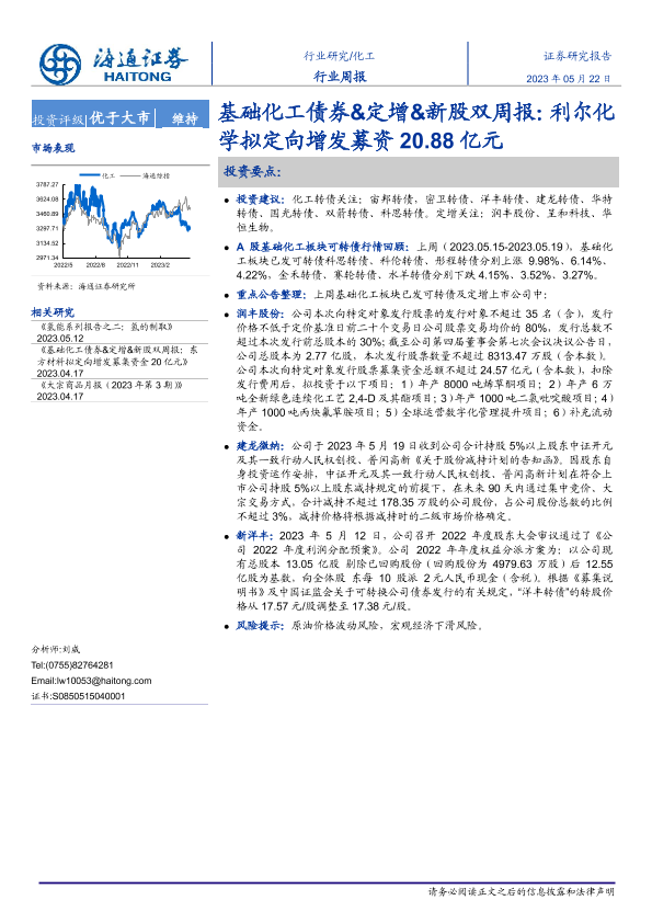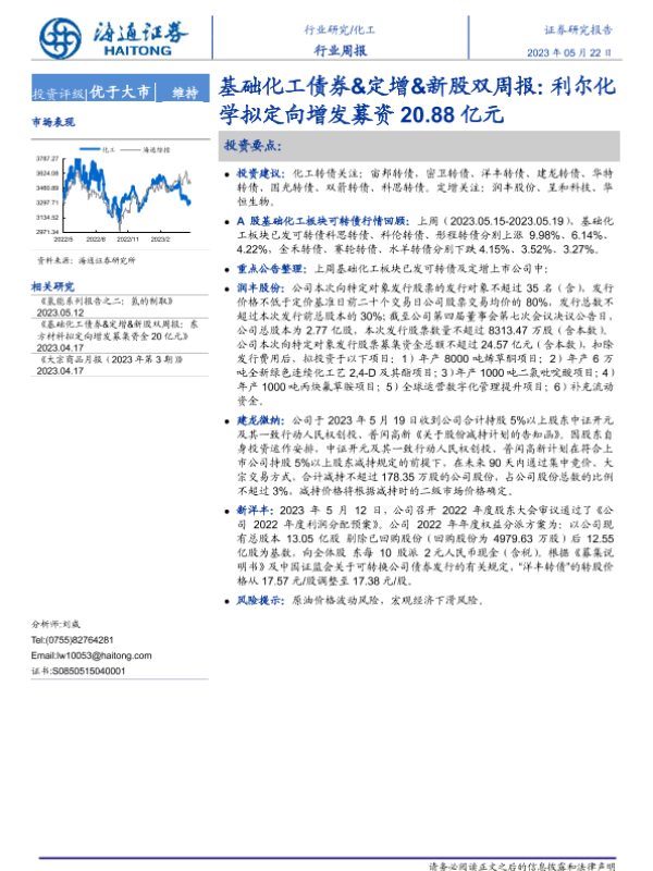 【海通证券】【20230522】基础化工债券&定增&新股双周报:利尔化学拟定向增发募资20.88亿元-18页