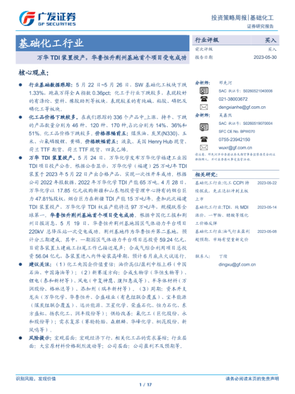 【广发证券】【20230530】20230530-广发证券-基础化工行业投资策略周报:万华TDI装置投产,华鲁恒升荆州基地首个项目受电成功-17页