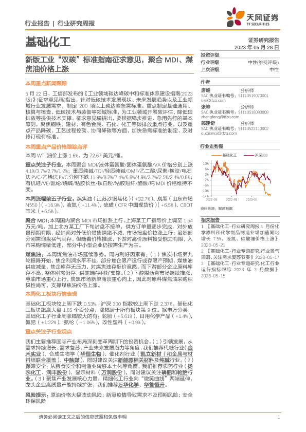 【天风证券】【20230528】20230528-天风证券-基础化工行业研究周报:新版工业“双碳”标准指南征求意见,聚合MDI、煤焦油价格上涨-19页