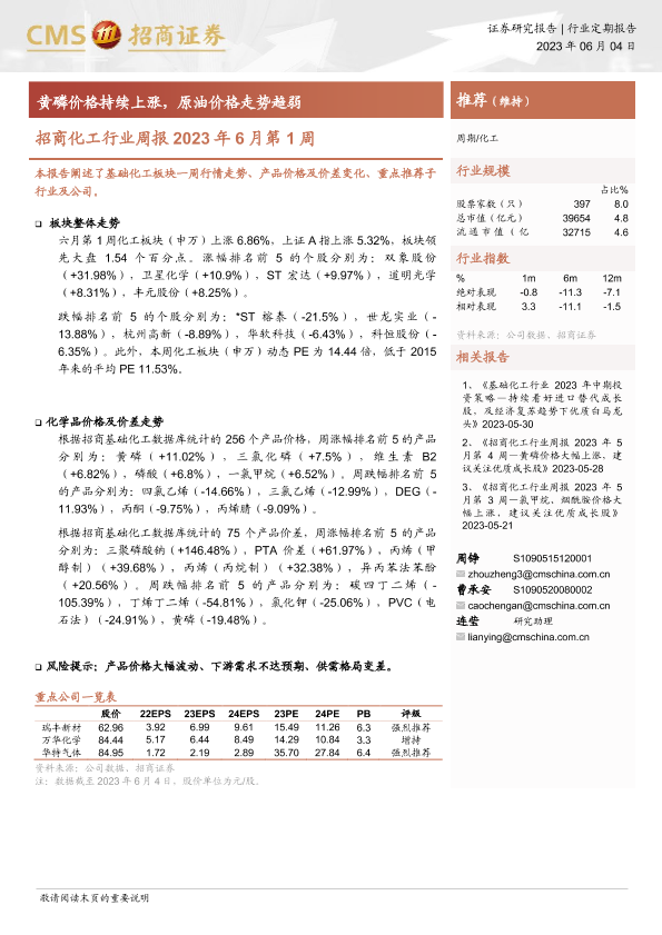 【海通证券】【20230604】招商化工行业周报2023年6月第1周:黄磷价格持续上涨,原油价格走势趋弱-23页