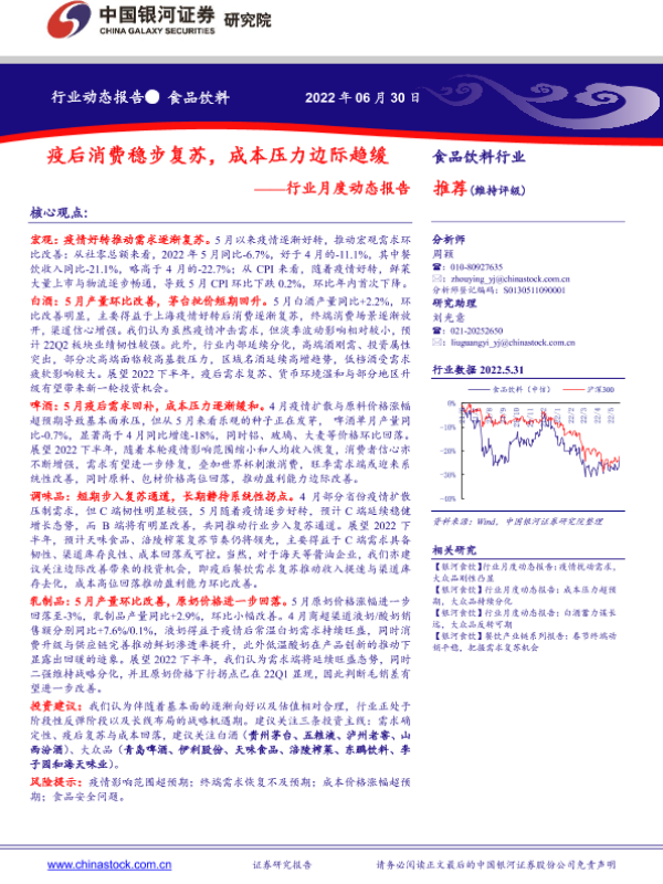【银河证券】【20220630】食品饮料行业月度动态报告:疫后消费稳步复苏,成本压力边际趋缓-20页