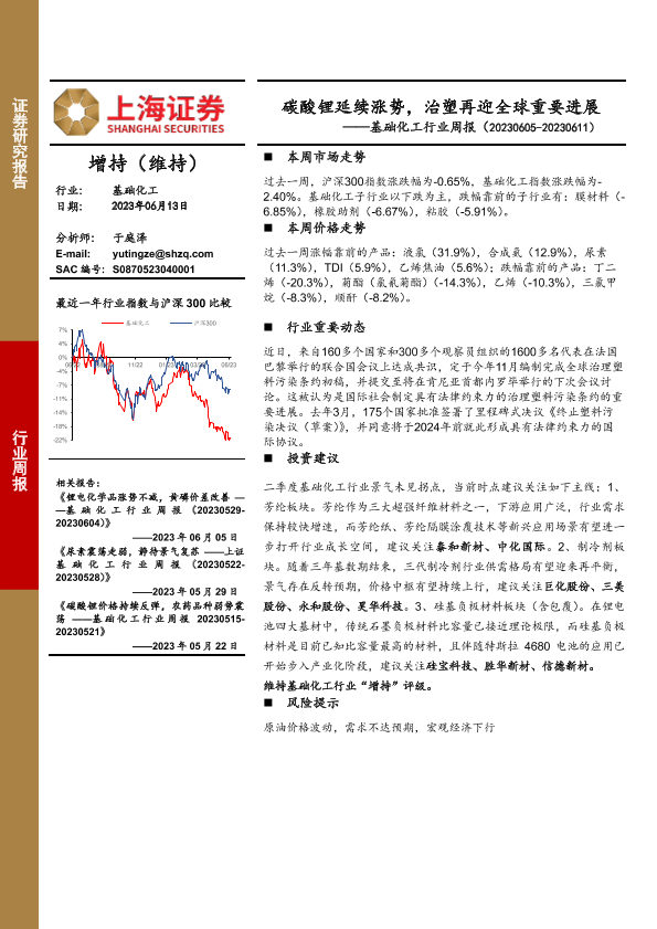 【上海证券】【20230613】20230613-上海证券-基础化工行业周报:碳酸锂延续涨势,治塑再迎全球重要进展-15页