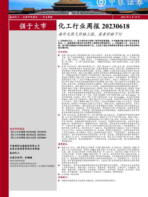 【中银证券】【20230618】20230618-中银证券-化工行业周报:海外天然气价格上涨,尿素价格下行-15页