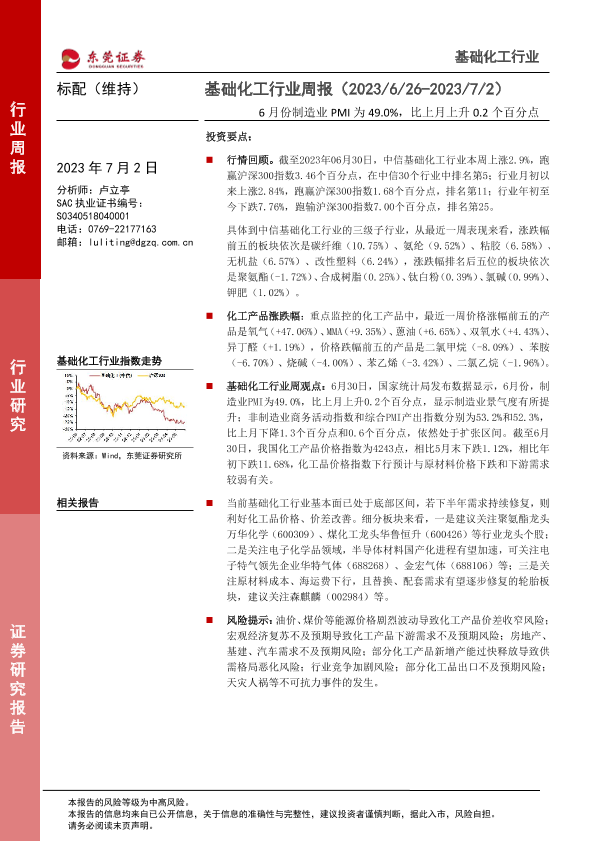 【东莞证券】【20230702】20230702-东莞证券-基础化工行业周报:6月份制造业PMI为49.0%,比上月上升0.2个百分点-11页