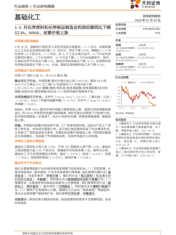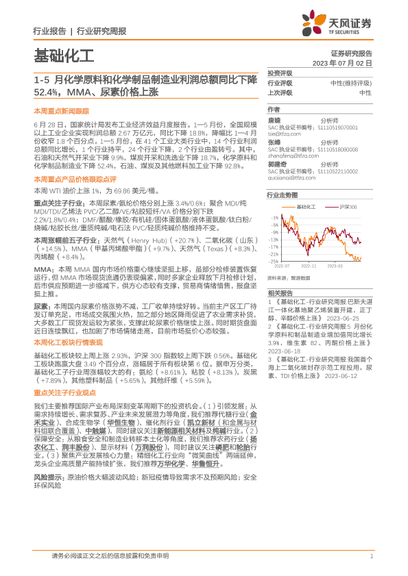 【天风证券】【20230702】20230702-天风证券-基础化工行业研究周报:1-5月化学原料和化学制品制造业利润总额同比下降52.4%,MMA、尿素价格上涨-19页