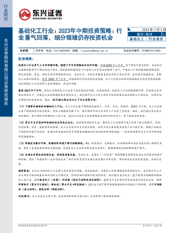 【东兴证券】【20230704】基础化工行业:2023年中期投资策略:行业景气回落,细分领域仍存投资机会-17页