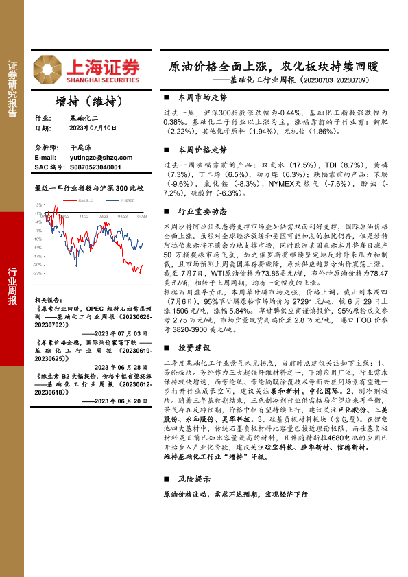 【上海证券】【20230710】基础化工行业周报:原油价格全面上涨,农化板块持续回暖-16页