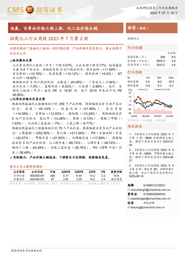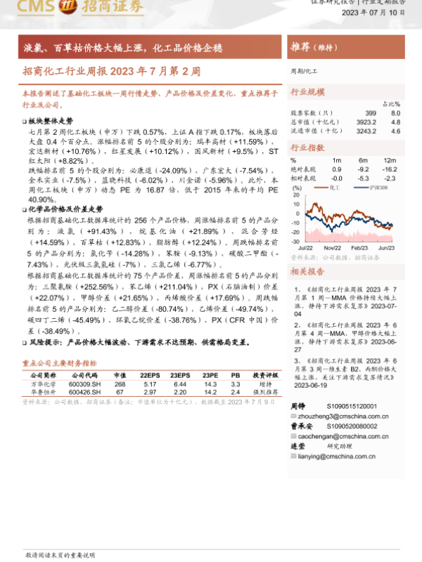 【海通证券】【20230710】招商化工行业周报2023年7月第2周:液氯、百草枯价格大幅上涨,化工品价格企稳-20页