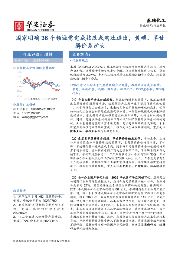 【华安证券】【20230709】20230709-华安证券-基础化工行业周报:国家明确36个领域需完成技改或淘汰退出,黄磷、草甘膦价差扩大-43页