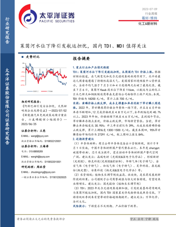 【太平洋证券】【20230709】20230709-太平洋-化工&新材料行业周报:莱茵河水位下降引发航运担忧,国内TDI、MDI值得关注-30页