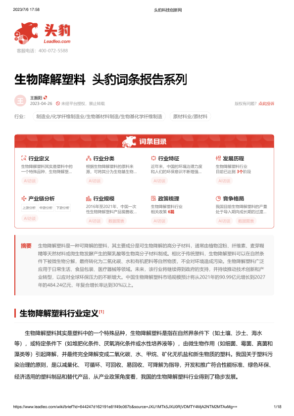 【头豹研究院】【20230426】生物降解塑料 头豹词条报告系列-18页