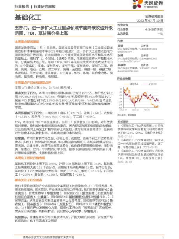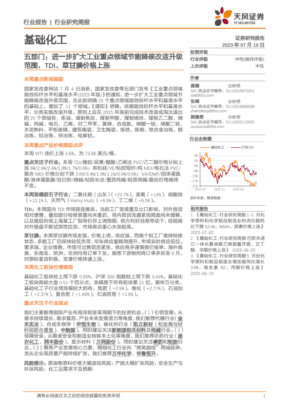 【天风证券】【20230710】基础化工行业研究周报:五部门:进一步扩大工业重点领域节能降碳改造升级范围,TDI、草甘膦价格上涨-19页