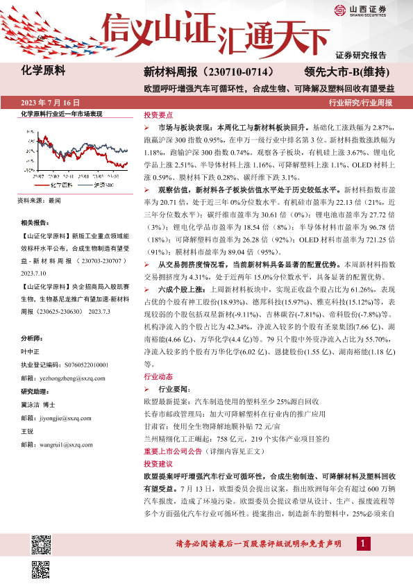 【山西证券】【20230716】新材料周报:欧盟呼吁增强汽车可循环性,合成生物、可降解及塑料回收有望受益-27页