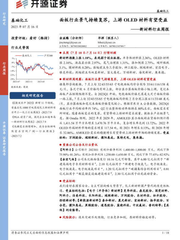 【开源证券】【20230716】20230716-开源证券-新材料行业周报:面板行业景气持续复苏,上游OLED材料有望受益-18页