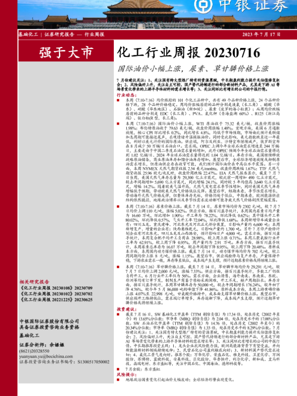 【中银证券】【20230717】20230717-中银证券-化工行业周报:国际油价小幅上涨,尿素、草甘膦价格上涨-20页