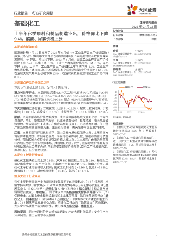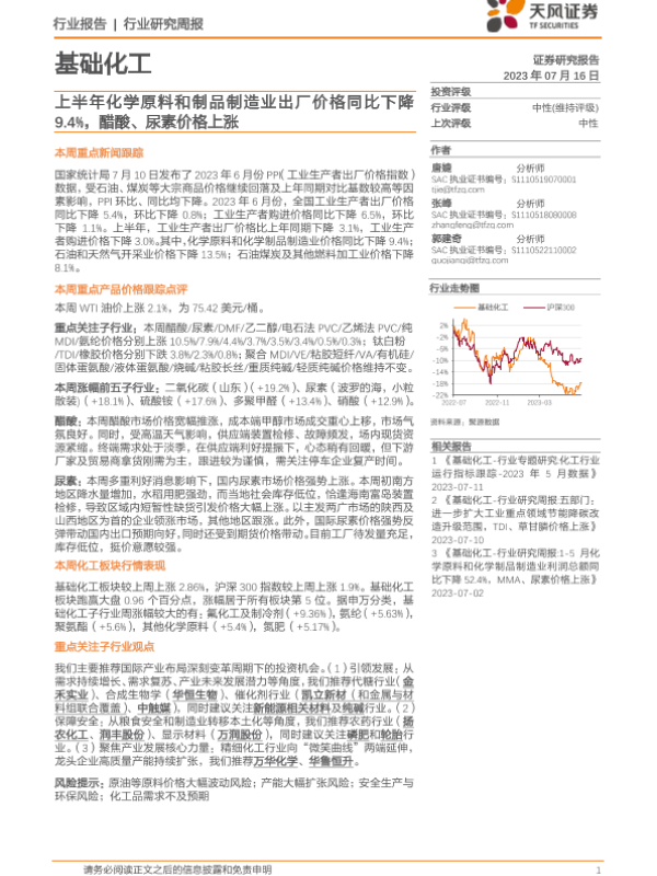 【天风证券】【20230716】20230716-天风证券-基础化工行业研究周报:上半年化学原料和制品制造业出厂价格同比下降9.4%,醋酸、尿素价格上涨-19页