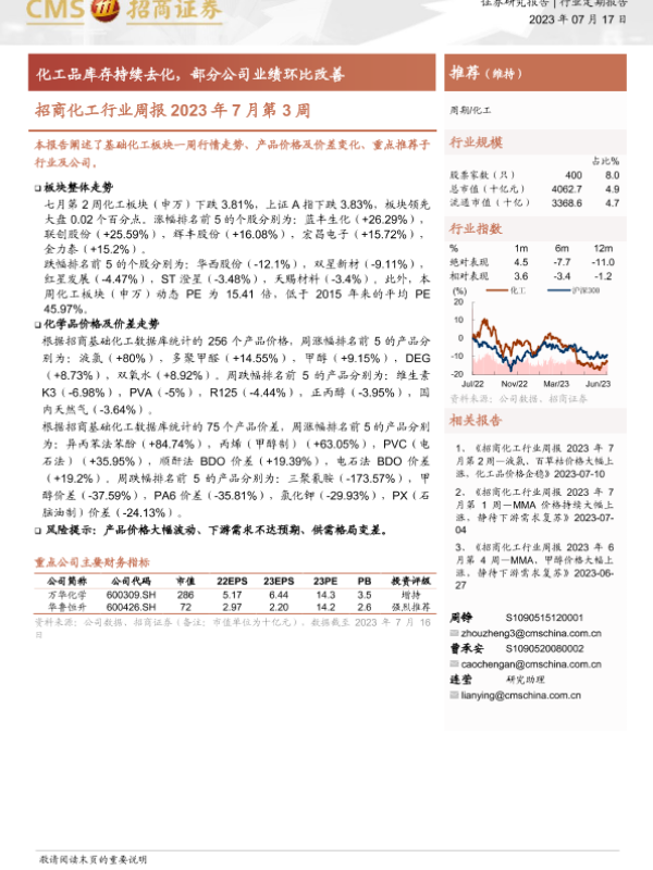 【海通证券】【20230717】招商化工行业周报2023年7月第3周:化工品库存持续去化,部分公司业绩环比改善-20页