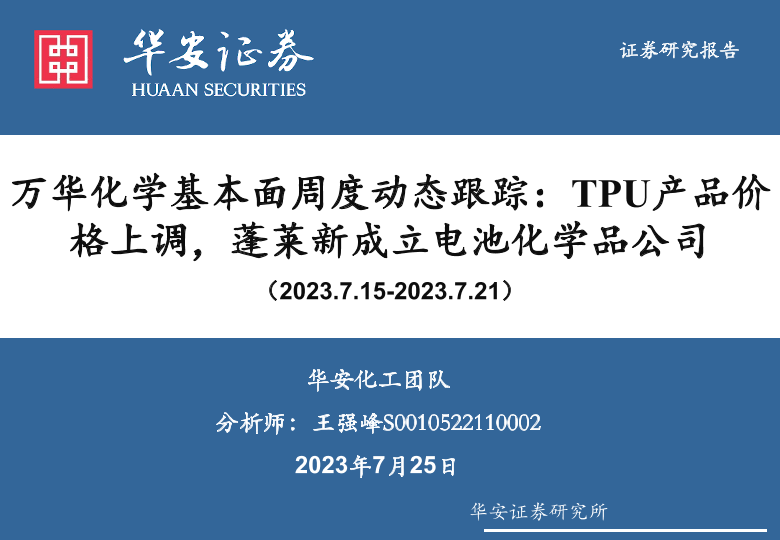 【华安证券】【20230725】20230718-华安证券-万华化学基本面周度动态跟踪:TPU产品价格上调,蓬莱新成立电池化学品公司-32页