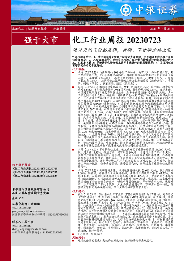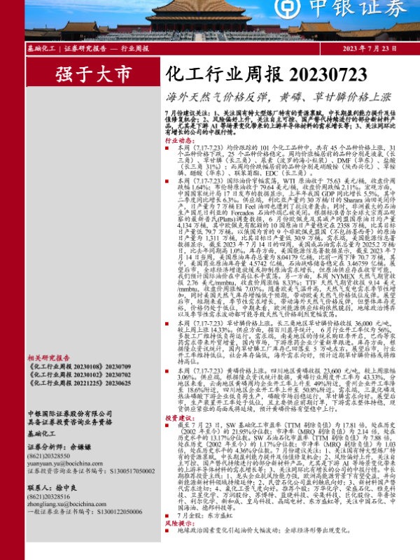 【中银证券】【20230723】20230723-中银证券-化工行业周报:海外天然气价格反弹,黄磷、草甘膦价格上涨-17页