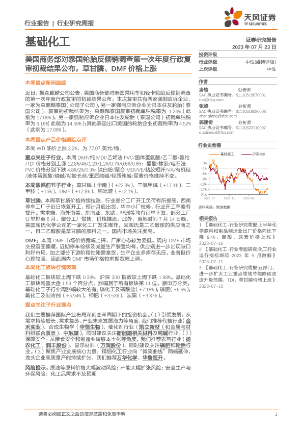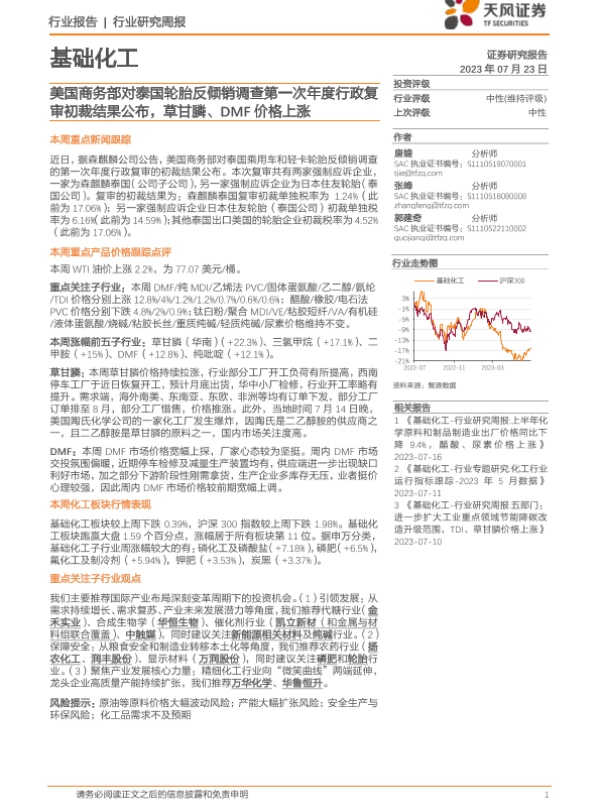 【天风证券】【20230723】20230723-天风证券-基础化工行业研究周报:美国商务部对泰国轮胎反倾销调查第一次年度行政复审初裁结果公布,草甘膦、DMF价格上涨-19页