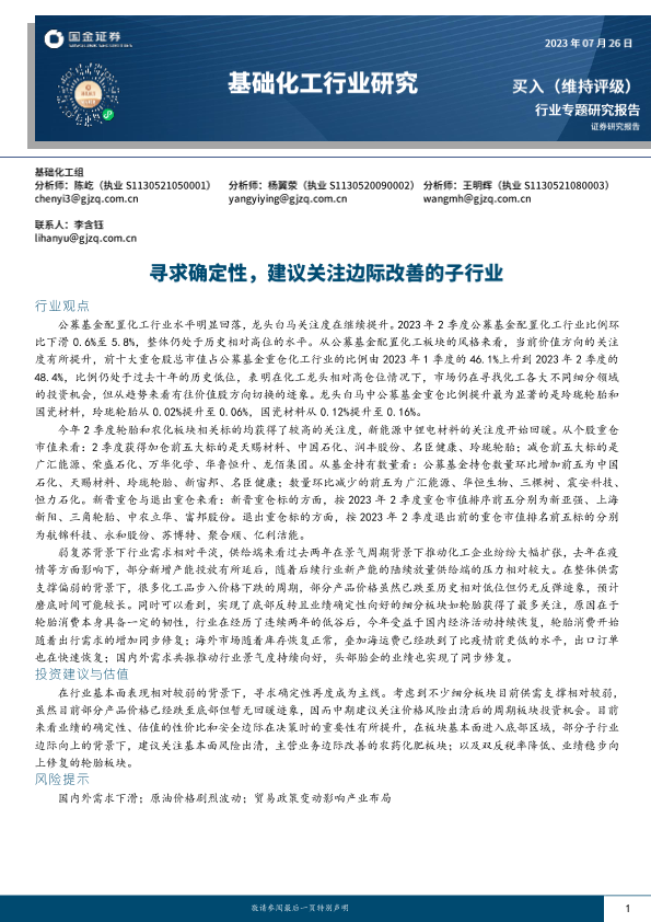 【国金证券】【20230726】20230726-国金证券-基础化工行业研究:寻求确定性,建议关注边际改善的子行业-18页
