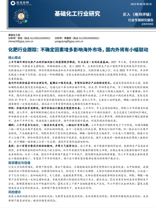 【国金证券】【20230806】20230806-国金证券-化肥行业跟踪:不确定因素增多影响海外市场,国内外将有小幅联动-23页