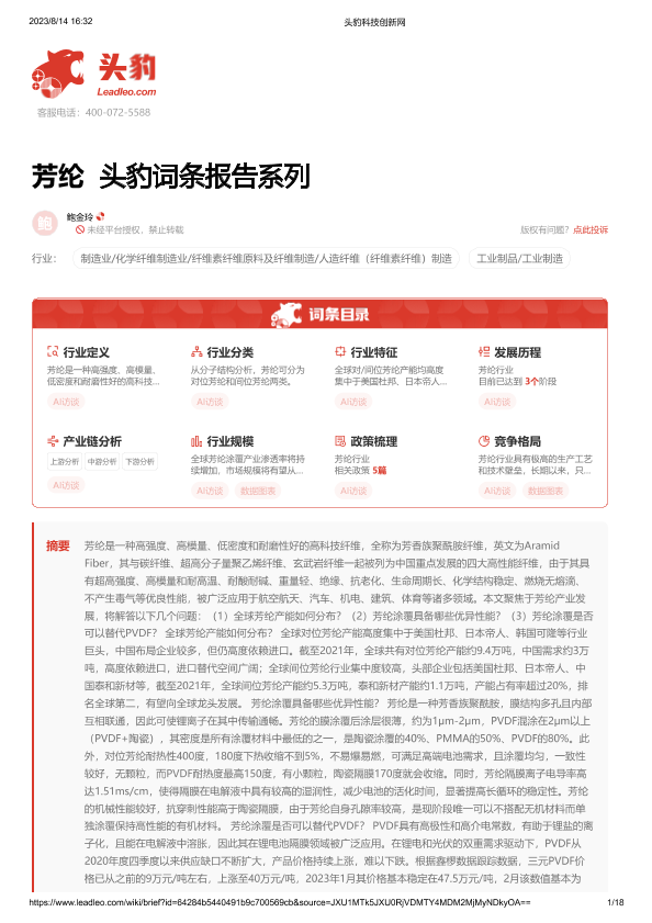 【头豹研究院】【20230814】芳纶 头豹词条报告系列-18页