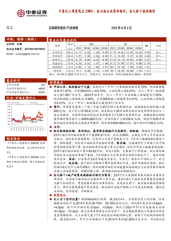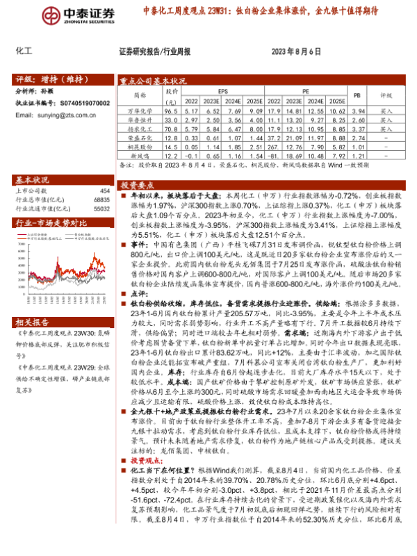 【中泰证券】【20230806】中泰化工周度观点23W31:钛白粉企业集体涨价,金九银十值得期待-29页