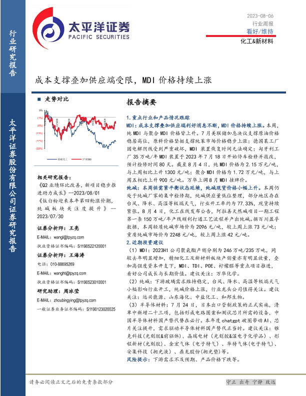 【太平洋证券】【20230806】20230806-太平洋-化工&新材料行业周报:成本支撑叠加供应端受限,MDI价格持续上涨-36页