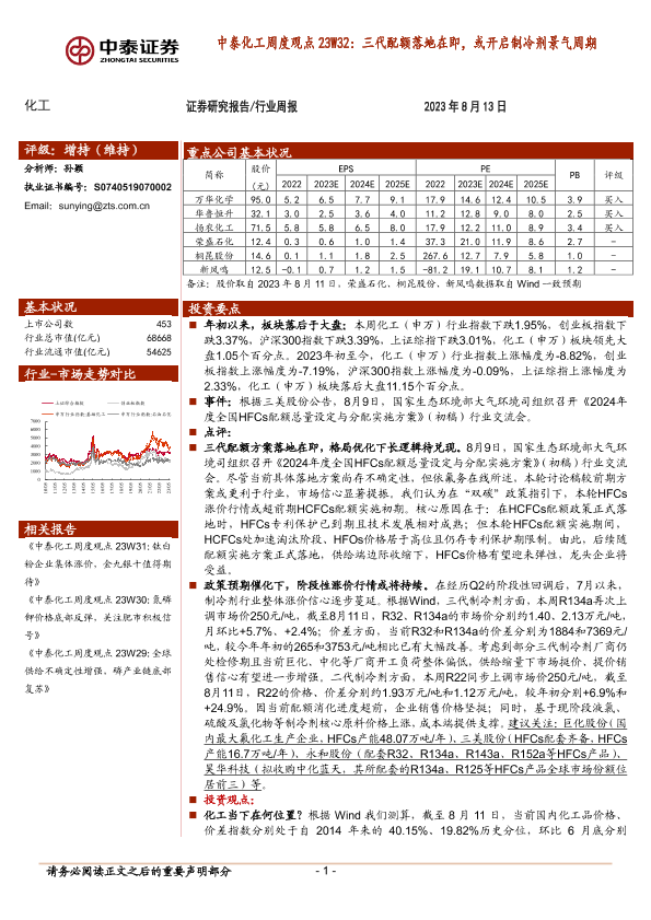 【中泰证券】【20230813】中泰化工周度观点23W32:三代配额落地在即,或开启制冷剂景气周期-31页