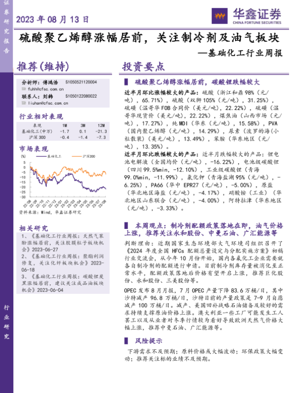 【华鑫证券】【20230813】20230813-华鑫证券-基础化工行业周报:硫酸聚乙烯醇涨幅居前,关注制冷剂及油气板块-29页