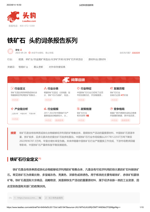 【头豹研究院】【20230524】20230814-头豹研究院-铁矿石 头豹词条报告系列-15页
