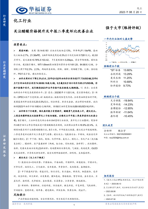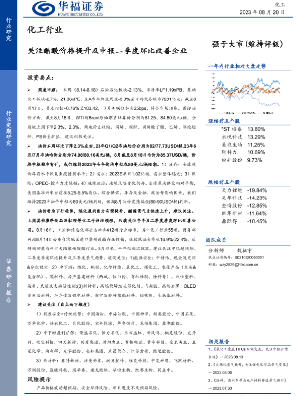 【华福证券】【20230820】化工行业:关注醋酸价格提升及中报二季度环比改善企业-34页