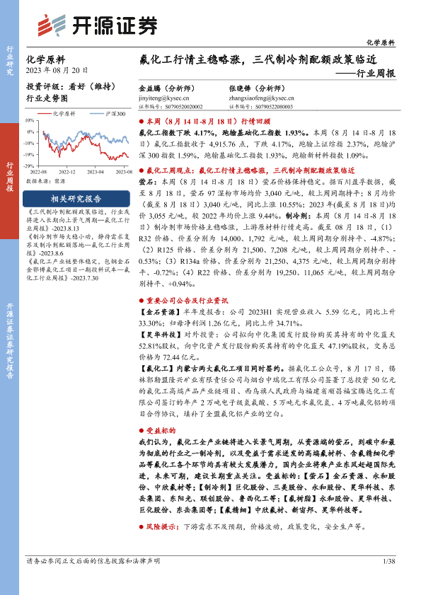【开源证券】【20230820】20230820-开源证券-化学原料行业周报:氟化工行情主稳略涨,三代制冷剂配额政策临近-38页