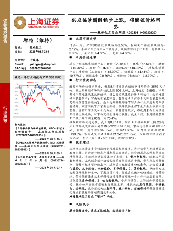 【上海证券】【20230823】20230823-上海证券-基础化工行业周报:供应偏紧醋酸稳步上涨,碳酸锂价格回落-19页