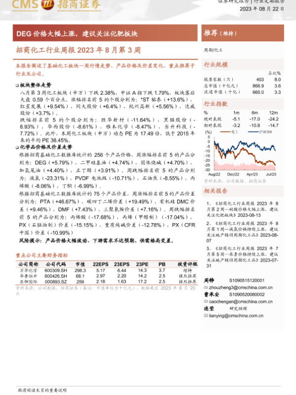 【海通证券】【20230822】招商化工行业周报2023年8月第3周:DEG价格大幅上涨,建议关注化肥板块-20页