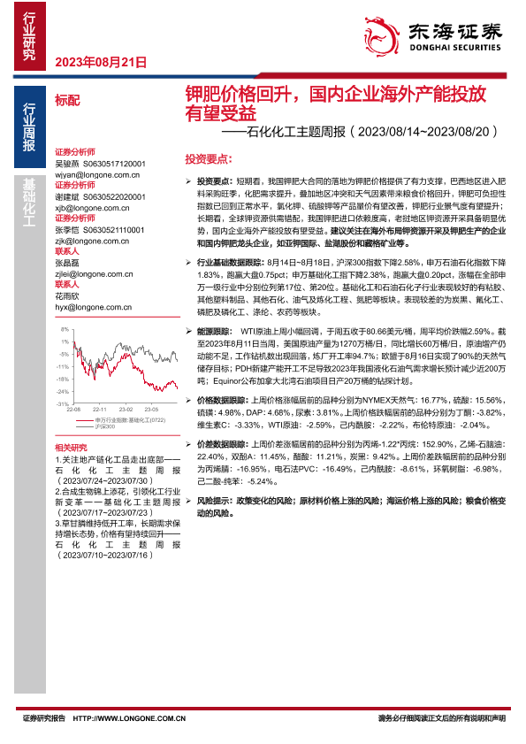 【东海证券】【20230821】20230821-东海证券-石化化工主题周报:钾肥价格回升,国内企业海外产能投放有望受益-24页
