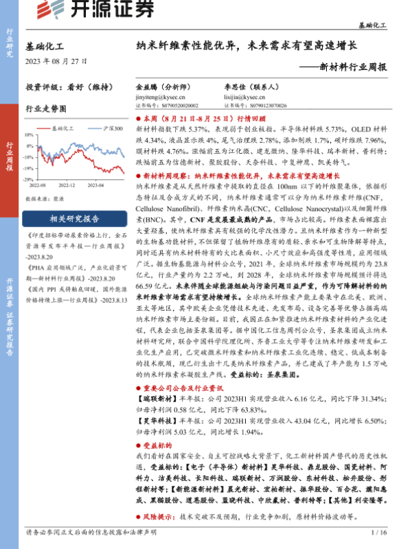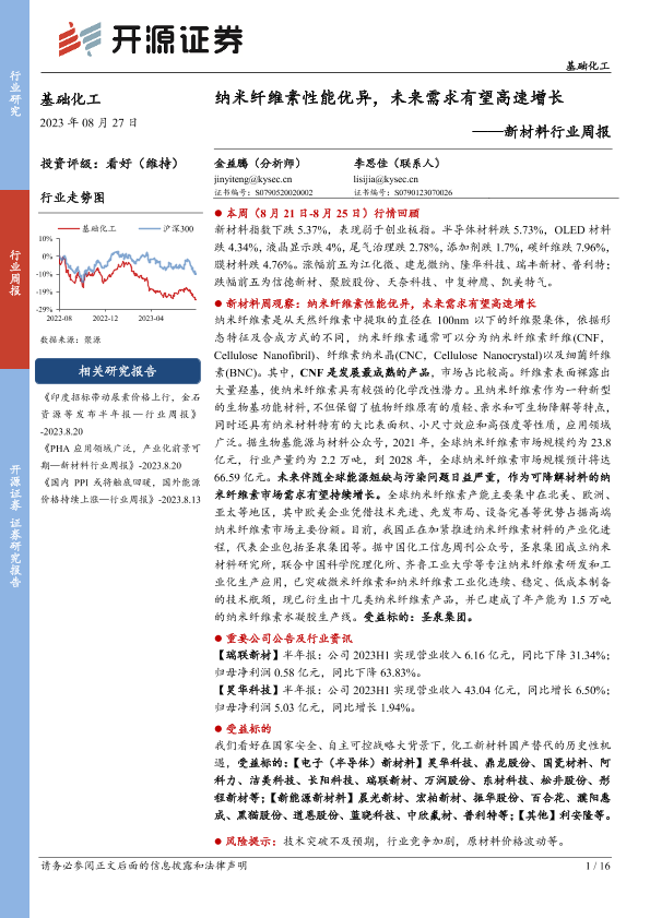 【开源证券】【20230827】20230827-开源证券-新材料行业周报:纳米纤维素性能优异,未来需求有望高速增长-16页