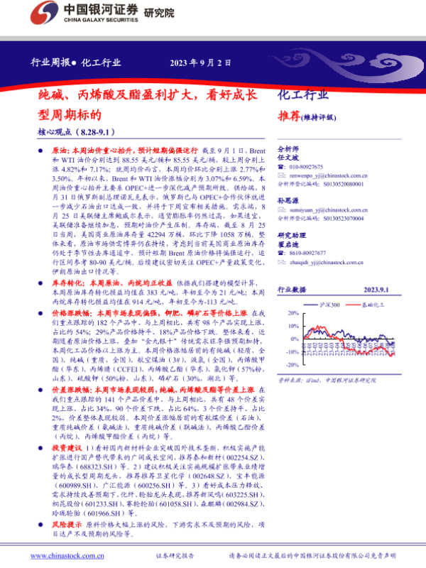 【银河证券】【20230902】20230902-中国银河-化工行业周报:纯碱、丙烯酸及酯盈利扩大,看好成长型周期标的-18页