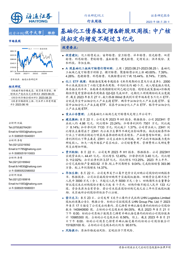 【海通证券】【20230829】20230829-海通证券-基础化工债券&定增&新股双周报:中广核技拟定向增发不超过3亿元-27页