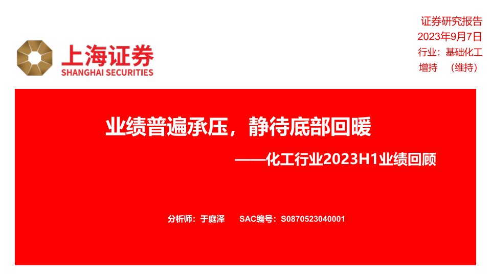 【上海证券】【20230907】化工行业2023H1业绩回顾:业绩普遍承压,静待底部回暖-13页