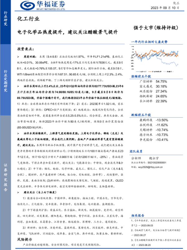 【华福证券】【20230910】20230910-华福证券-化工行业:电子化学品热度提升,建议关注醋酸景气提升-30页