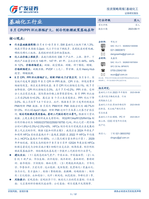 【广发证券】【20230911】20230911-广发证券-基础化工行业投资策略周报:8月CPI PPI环比涨幅扩大,制冷剂配额政策落地在即-17页
